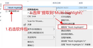 6. 然后打开解压后的文件夹,在文件夹里会显示一个crx格式的文件和一个使用说明文档,将crx文件右击,选择”解压到/提取到Multi-highlight“,如图8、图9所示