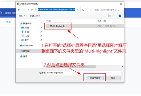 13. 在打开的”选择扩展目录“里找到存放在桌面的,刚才解压完文件夹里的”Multi-highlight“文件夹,选择完之后,点击下方的”选择文件夹“按钮,如图16所示